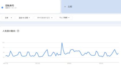 回転寿司という検索が高まるタイミングは土曜日または日曜日です。お盆期間を除くと、土日に検索数が増える綺麗な波形を描きます。はま寿司は顧客欲求が高まるタイミングで広告を強化するため、回転寿司を食べたいという欲求を持ったお客様を集客できるのです。
