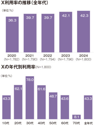 競合SNSサービスが毎年多数登場しているが、『X』の利用率は年々上昇している。とりわけ、若年層に多く利用されている点が特徴的だ。