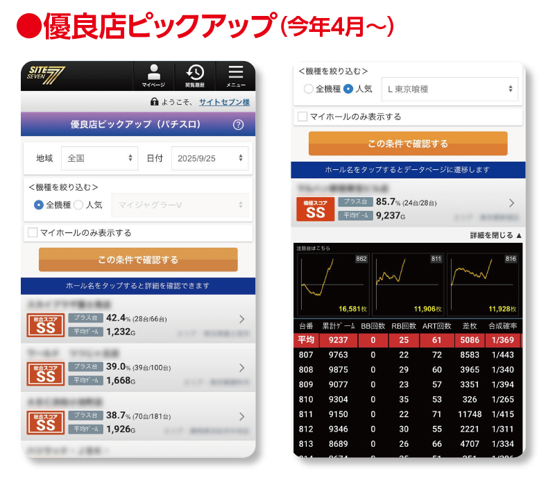 『サイトセブン』の独自AIによって「出玉状況が優秀であったホール」をスコア化(SS、S、Aの上位ランクのみ表示)。店舗の総合スコアだけでなく、個別機種ランクも表示されるので強化機種の出玉状況をファンに的確に伝えることもできる。