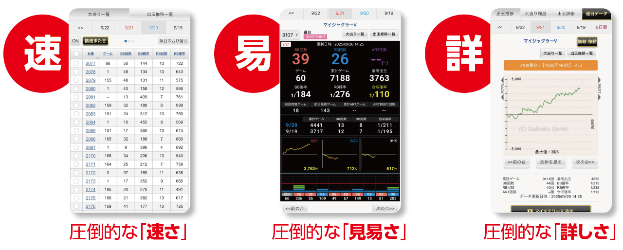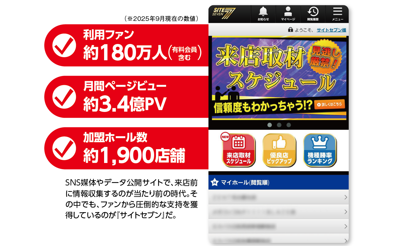 ファン目線の「速さ・見易さ・詳しさ」に徹したインターフェースや情報は、ホール・遊技台選びに欠かせない存在として支持されている。現在の利用ファンは実に約180万人。全国各地域に多数の利用ファンが存在するため、『サイトセブン』に加盟して自店の台データを公開することで、商圏内ファンに容易に認知を拡大でき、来店促進に繋げられる。