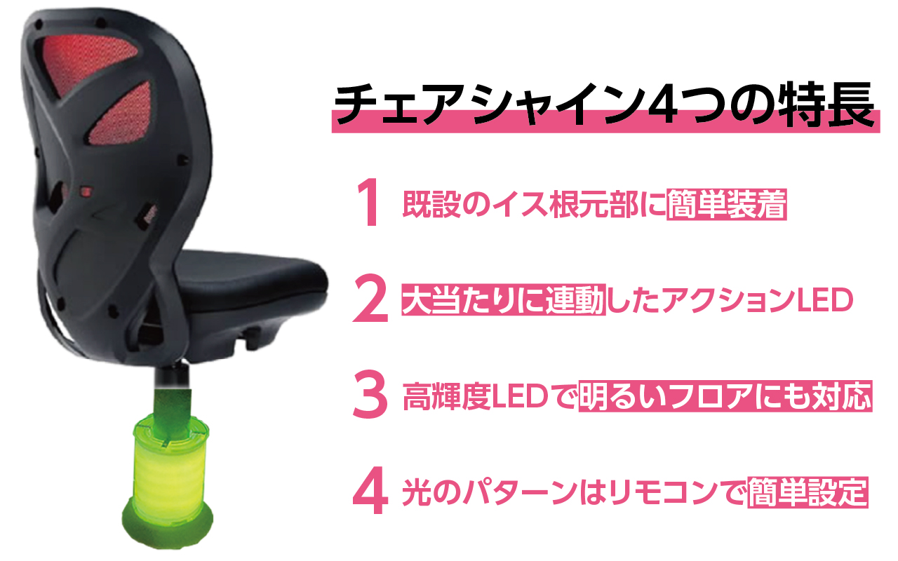 『チェアシャイン』は、既設の各台のイス根元部に簡単装着できるアクションLED。代表ランプ(トップランプ)からの信号を受けて、大当たりに連動したLED演出を実現する。
