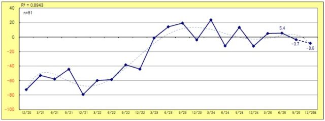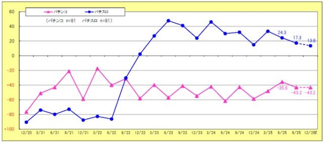 稼動状況では、パチンコが▲43.2ポイント(前回比7.6低下)と依然厳しく、3カ月後も同水準で推移する見込み。一方、パチスロは17.3ポイント(同7.0低下)とプラス圏を維持したものの、年末にかけて13.6ポイントまで低下する見通しとなった。遊技料金別では、4円パチンコが▲55.0ポイント(同10.8上昇)と改善傾向を示したが、20円パチスロは13.6ポイント(同2.6低下)とやや減速。一方で、低貸メダルパチスロは42.1ポイント(同12.2上昇)と堅調だった。