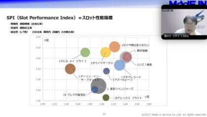 今回のセミナーでは、同社が独自に開発した新指標「SPI(Slot Performance Index)」を解説。SPIは稼働だけでなく、収益性や設置優位性など複数要素を統合的に数値化し、従来の感覚的な評価から脱却して客観比較を可能にするものだ。