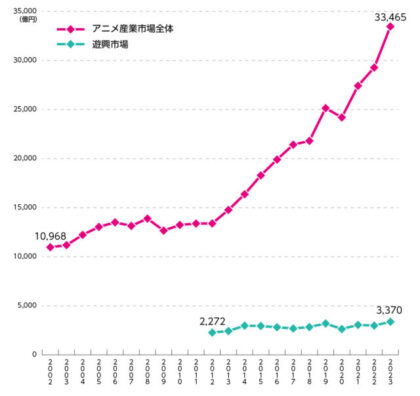 ■アニメ産業市場全体と遊興市場の推移(単位:億円)出典:公表の統計ならびに日本動画協会が行っているアンケートに基づき独自算出・日本動画協会 独自算出