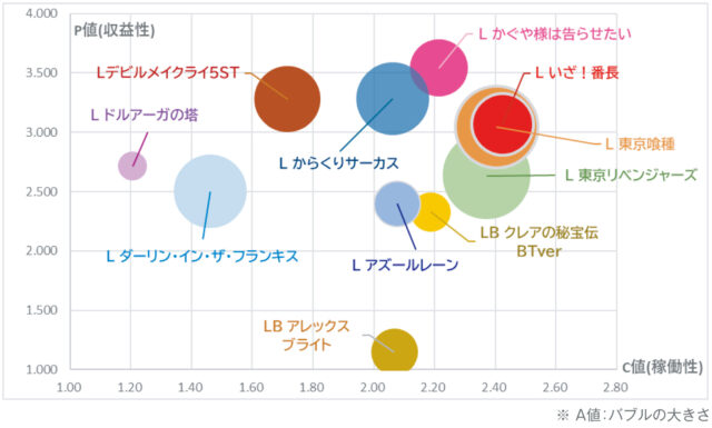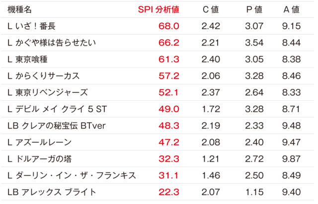 今回の例で総合力を示すSPI分析値を見ると『Lいざ!番長』、『Lかぐや様は告らせたい』、『L東京喰種』が上位。いずれもC値・P値が高水準で、中でも『Lいざ!番長』は高いA値で余剰導入力の余地も示唆されるため、今後の導入や増台検討の価値が高いといえるでしょう。