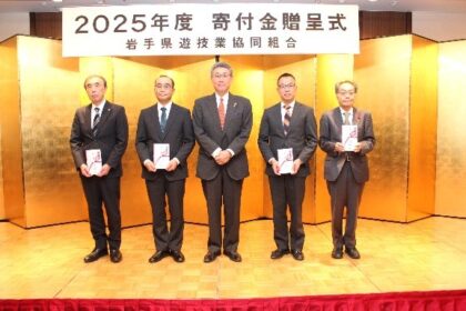 岩手県遊技業協同組合(工藤嘉理事長)は10月14日、盛岡市のホテルメトロポリタンで、県内の公益事業4団体に対し、社会貢献活動の一環として寄付金を贈呈した。