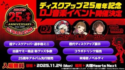 同イベントは、「25年分の想い出と音楽が交差する、一夜限りのアニバーサリーナイト」として企画されたもの。『DISC UP』シリーズでおなじみの「SINDY」や、パチンコ・パチスロVTuber「上乗恋」、サミー主体の音楽プロジェクト「S.S.P」、ライターの「HYO.」(パチスロ必勝本所属)など、多彩なゲストDJが出演する。