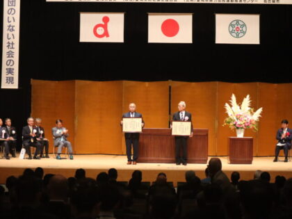 HOME > 業界ニュース > 長年の暴力追放活動が評価、半田遊技業組合が表彰 投稿日:2025年10月27日 表彰状を掲げる半田遊技業協同組合の新美組合長 愛知県遊技業協同組合の支部組合である半田遊技業協同組合(新美保則組合長)は10月16日、名古屋市の日本特殊陶業市民会館で開催された「2025年度安全なまちづくり愛知県民大会」において、中部管区警察局長および中部ブロック暴力追放運動推進センター連絡協議会会長から表彰を受けた。 同組合は平成23年からの長期にわたり、地域の安全確保に向けて暴力追放運動を勇気と熱意をもって推進してきた。その積年の取り組みが認められ、今回の受賞に至ったもの。 表彰式の様子 -業界ニュース, 社会貢献 -愛知県遊協, 暴力追放運動