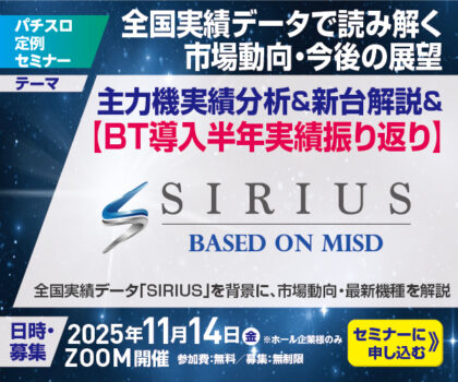特に最新機種解説では、主要複数メーカーの機種開発にも携わっている同社ならではの機種評価ノウハウをフル活用。同社webサイト「WEB SIRIUS(webシリウス)」にて配信している人気コンテンツ“導入前新台評価”での導入前機種分析内容と、“導入後1カ月レポート”による市場導入後の実績データを照らし合わせながら、今後の運用のポイントとなる機種特徴や設定活用指南などを詳細解説する。
