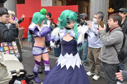 パレードでも、各社のキャラクター(写真はツインエンジェル)は人気の的となった。