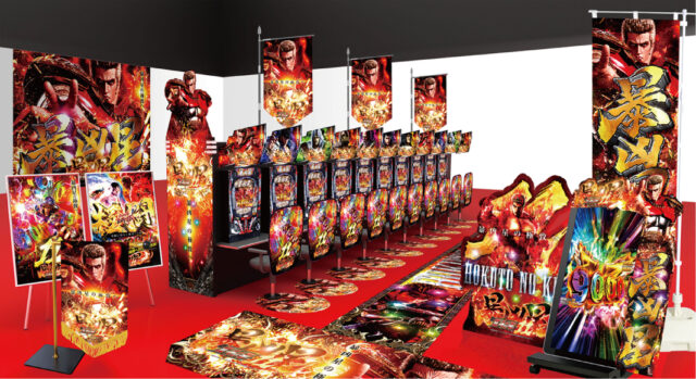 ビジュアル・スケール・光量・色彩のすべてを「シリーズ史上最大級」に設計。赤と金を基調とした燃えるような演出空間は、店内の導線上どこからでも強烈なインパクトを放ち、ユーザーの視線を一瞬でロックします。キャラクターパネル・大型バナー・専用什器・足元マット・筐体パネルまで統一デザインで構成することで、『暴凶星』一色の世界観を完全再現。導入初日からホール全体を「北斗の聖域」として演出します。