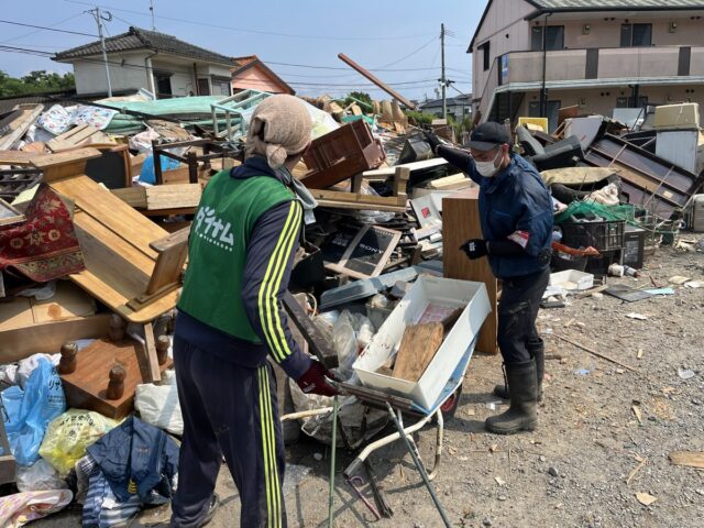 霧島市で災害支援のボランティア活動を行うダイナム社員ら。