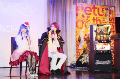 オーイズミは11月26日、スマスロの新機種『Lパチスロ うみねこのなく頃に2』(オーイズミ・アミュージオ製)のプレス発表会を、都内渋谷のパセラリゾーツ渋谷で開催した。当日は、スペシャルゲストとして、舞台版「うみねこのなく頃に」で右代官戦人役を務める俳優の川隅美慎さん(写真右)と、古戸ヱリカ役の遥りささんが実際の舞台で着用していたという衣装で登場。発表会に華を添え、新台をピーアールした。