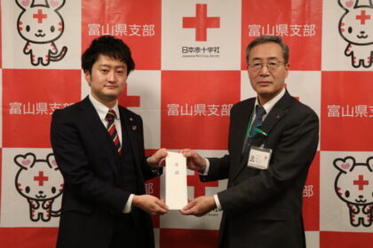 預託当日は、日本赤十字社富山県支部の布野浩久事務局長に対し、澤田グループ(㈱ノースランド)の澤田勇樹取締役統括管理本部長が義援金を手渡した。