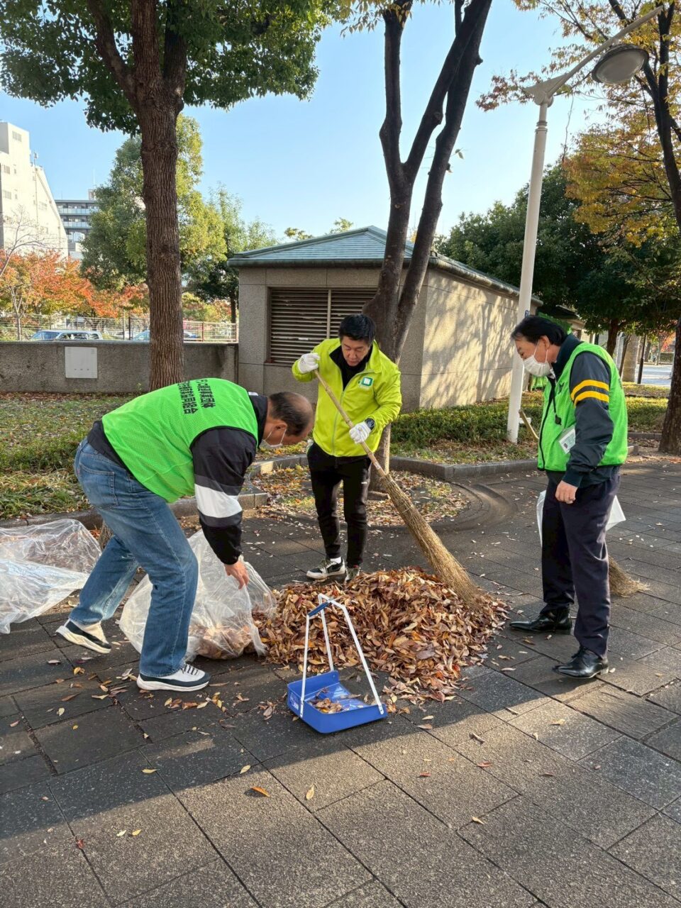 毎年実施している同活動だが、今回は大阪府が実施する「ごみゼロアクション~大阪秋の陣~」として参加。軍手やゴミ袋の提供を受けながら、公園内に散乱している落ち葉やゴミを約11袋分回収した。