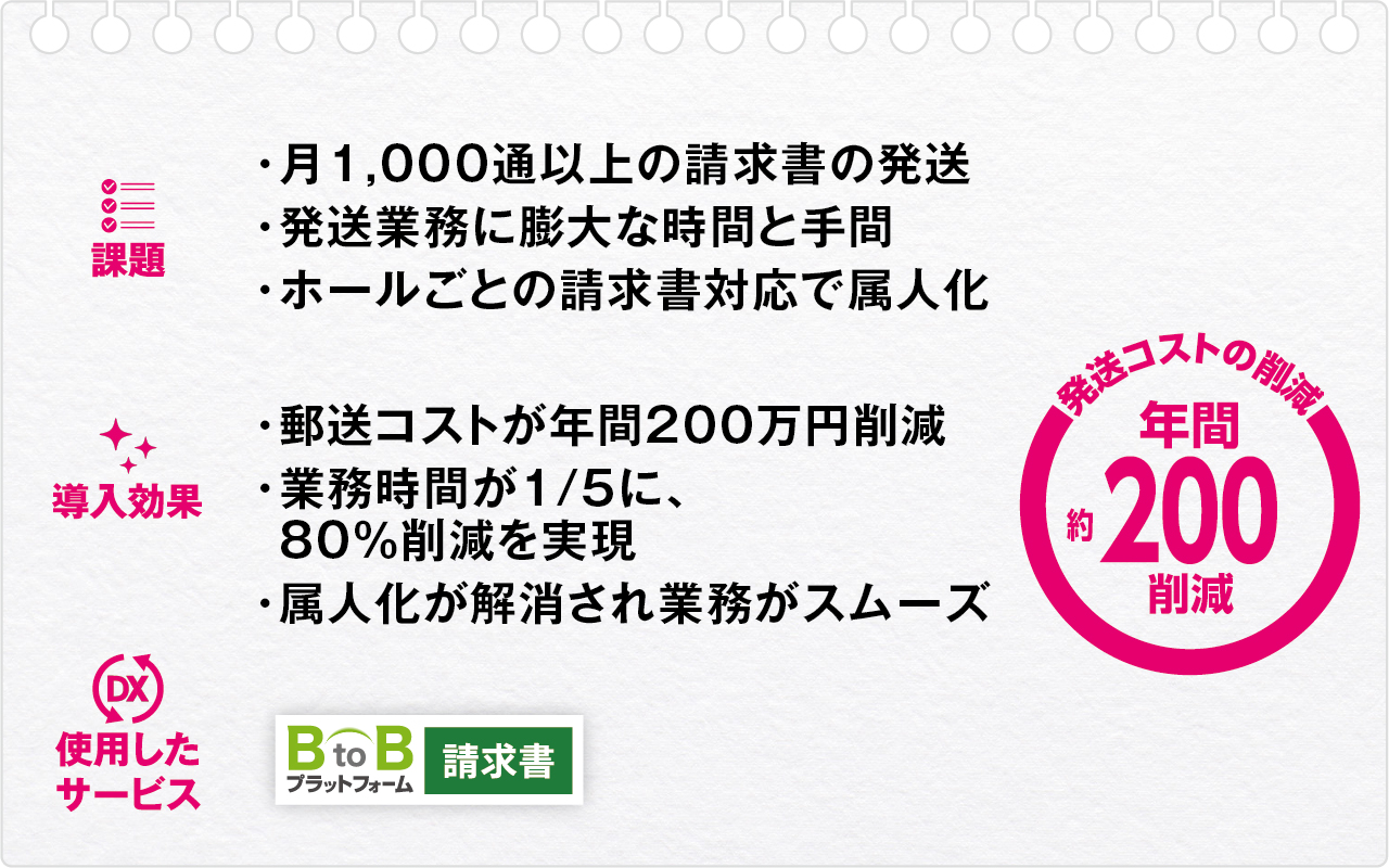 導入以前、同社では月1000通を超す請求書を手作業で封入・発送していた。書類を折り、封筒に入れ、切手を貼るだけでも膨大な時間がかかり、月末や連休前は残業が常態化。さらに発送漏れなどのヒューマンエラーや、ホールごとに異なる書式対応による属人化が課題となり、作業が止まることもあった。