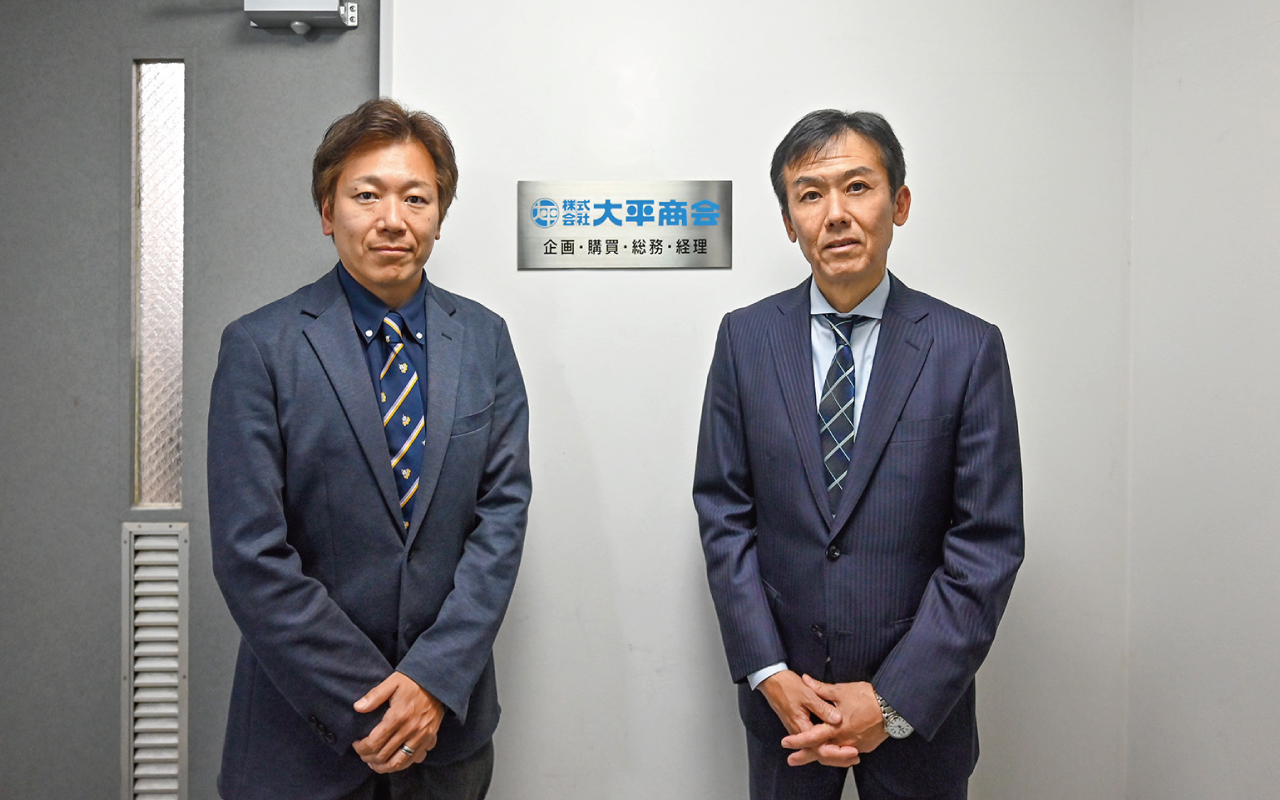 大平泰弘代表取締役社長(右)と同社・情報システム課の吉川拓馬係長。