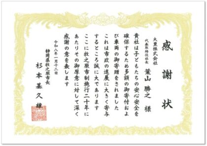 これは、市政の進展に大きく寄与した企業・団体として評価されたもの。同社はこれまで、「地域社会との共生」を重要な経営課題に位置づけ、継続的に地域貢献活動を展開してきた。今回の感謝状は、次世代を担う子どもたちの安心・安全な生活環境づくりを目的とした多額の寄付や車両の寄贈といった取り組みが高く評価された結果となる。