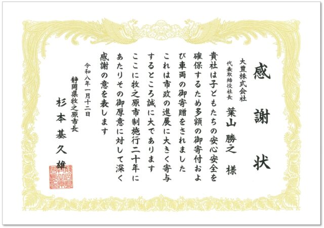 大豊が受贈した牧之原市からの特別感謝状。