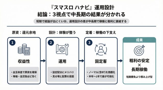 『スマスロ ハナビ』は、導入直後に勝負が決まる台ではありません。「収益性」、「運用」、「固定客」の3点で、じわじわとホールの実力差が出る台です。スマスロノーマルを単なる「入替要員」ではなく、一つの「戦力」として扱えるホールほど、ボディブローのようにその効果が効いてくるはずです。導入判断とその後の運用計画の一助となれば幸いです。