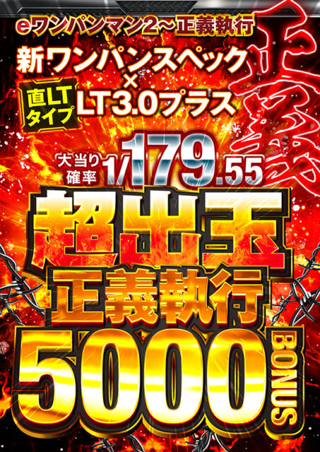 さらに、大当たり確率約1/179.55という遊びやすいライトミドルスペックながら「正義執行5000BONUS」が約50%の割合で発生し、最大5,000個の出玉を獲得できる一撃性を実現。この高インパクトな設計は、ユーザーの期待感を大きく刺激します。