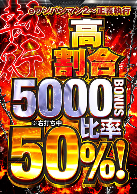 初当たりおよびRUSH中において「50%」という高割合で5,000BONUS(最大5,000発)を獲得できる点が最大の魅力であり、この「半分で5,000発」というインパクトは、従来機と一線を画す明快かつ強力な訴求軸となります。