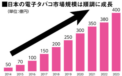 国内外で電子タバコ市場が拡大を続けている(※下表参照)。特にニコチンやタールを一切含まない『ポケットシーシャ』は、タバコ特有の匂いがなくファッション感覚で楽しめることから、若年層や女性を中心に支持を集めているのが特徴だ。