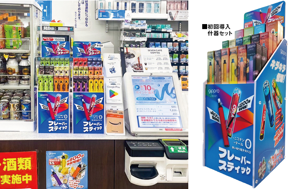 「初回導入什器セット」の設置イメージ。定番人気の『NEO』や『BLINGBLING』の組み合わせセットで、ホールで需要の高いフレーバーに絞った納品や、箱をカットしての陳列など、ホールごとの要望に合わせた柔軟な対応を行う。