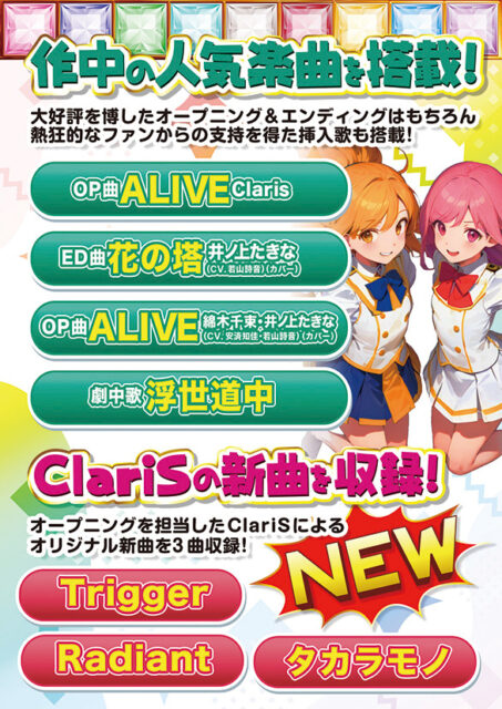 宝石調の背景と大見出しでまず視線を止め、「人気楽曲」「新曲収録」といった強いベネフィットを最上段および最下段に配置して訴求点を明確化。中段はOP/ED、カバー、劇中歌を帯レイアウトで整理することで、初見でも内容が一瞬で理解できます。