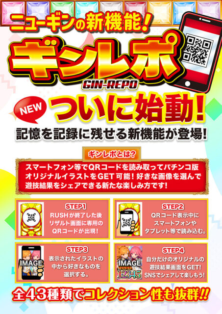 「ギンレポ」は、RUSH終了後のリザルトに出るQRをスマホで読み取り、オリジナルイラストを選んで「自分だけの結果画面」を保存およびSNS共有できる新機能です。遊技が思い出として残り「次はもっと良い記録」「別絵柄も集めたい」と再挑戦の動機づけに最適です。コレクション欲求を刺激する販促ツールとして準備してみてはいかがでしょうか。