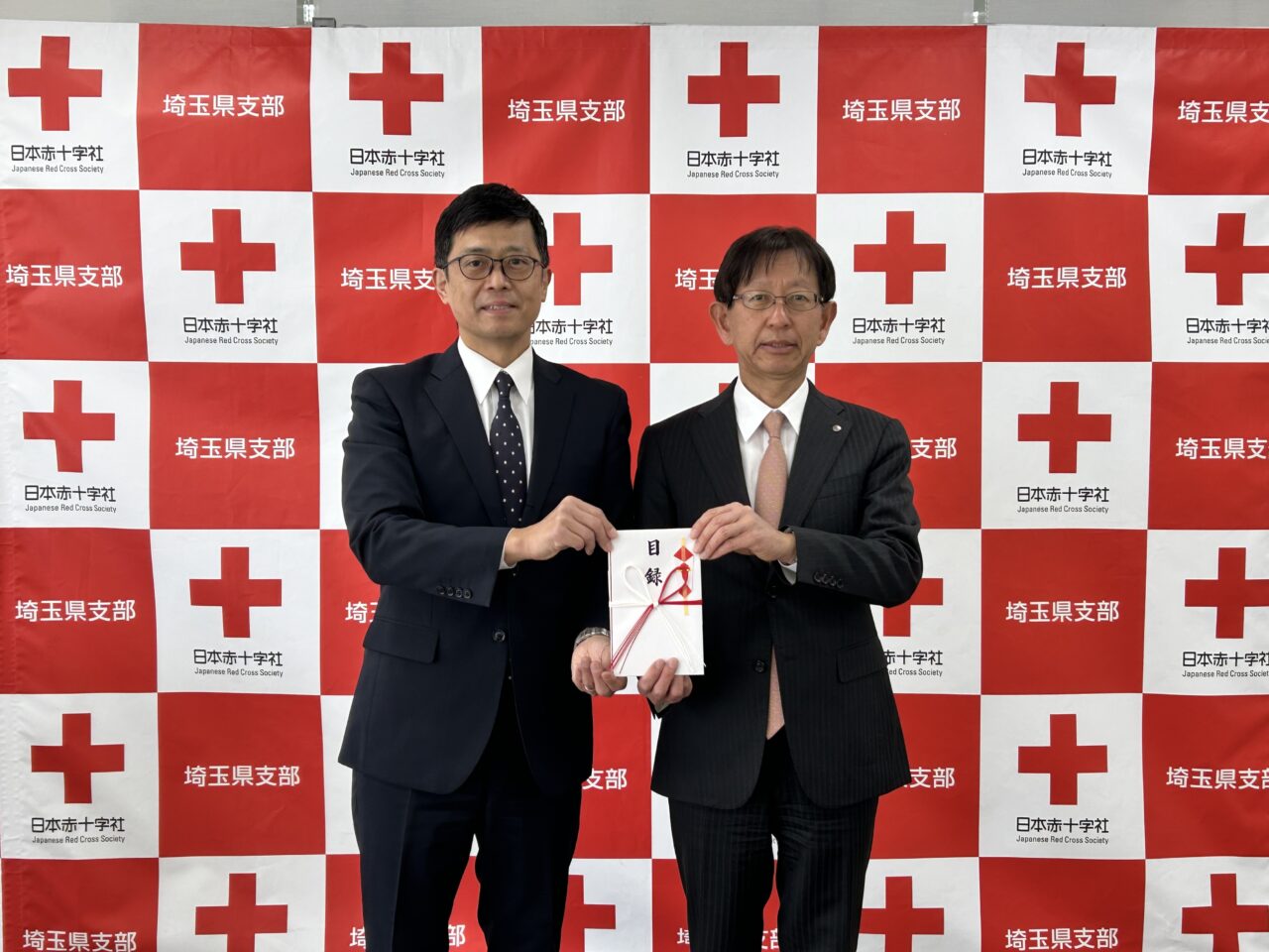 趙理事長から日赤埼玉県支部の細野事務局長(右)へ目録を贈呈した。