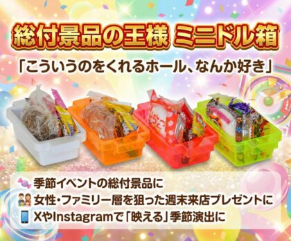 ゴールデンウィークは年間最大の集客チャンス。長期連休に来店するお客様へ「また来たい」と思わせる一手が、ホールの差別化を決定づける。そんなGW集客施策にぴったりの景品として、長年、注目を集めているのが『ミニドル箱』。パチンコ業界専門ECモール『GBモール』で好評販売中の本商品は、配りやすさ・コスト管理・お客様満足度の三拍子が揃った、GWイベントの即戦力アイテムだ。