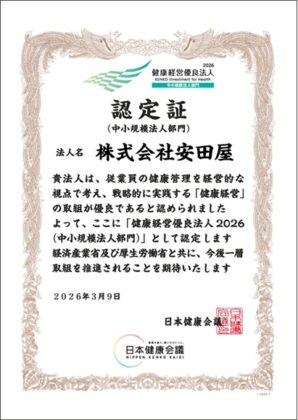 安田屋は3月10日、経済産業省の健康経営優良法人認定制度に基づき、日本健康会議より「健康経営優良法人2026」に認定された。2023年に初めて認定を取得して以来、今回で4年連続の認定となる。