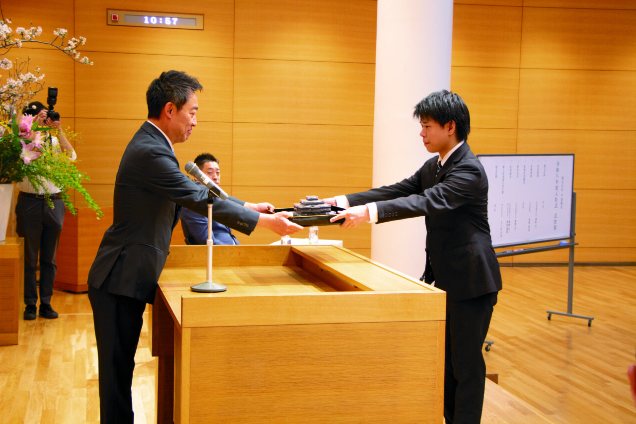 辞令交付、社章授与を行う東野昌一社長(左)。