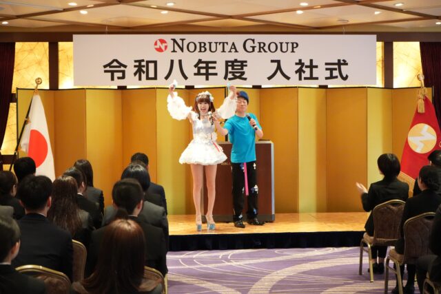 当日は、延田尚弘代表取締役社長の厳かな式辞の後、会場後方から2人が登場。静寂としていた場内は一転して笑いに包まれ、緊張した面持ちだった新入社員にも笑顔が広がった。トークでは、失敗を恐れず挑戦する姿勢や、どんな状況でも前向きに振る舞うことの大切さなどが語られた。
