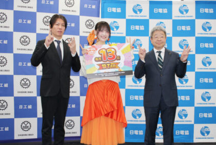 「13」のポーズでフォトセッションに応じる、左から日工組の榎本善紀理事長、茉井ひなたさん、日電協の小林友也理事長。