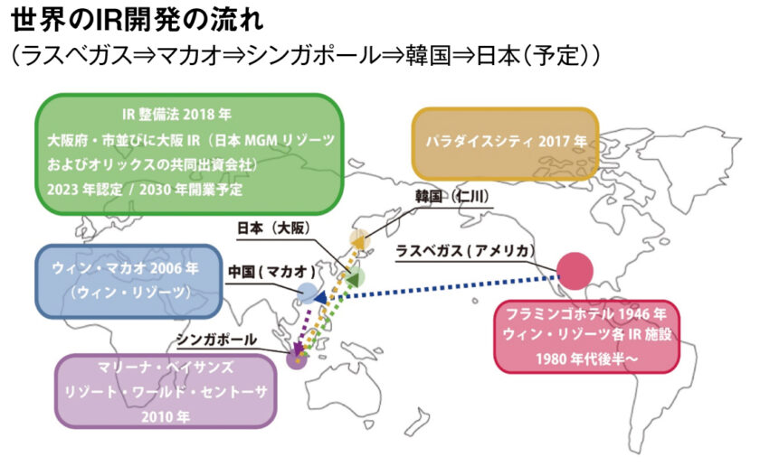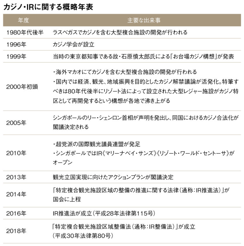 IRの原型は前述したように、1980年代後半のラスベガスホテルの大型開発でした。一方、国内においては1990年代後半に合法化への法改正や経済効果、社会的影響に関する分析研究が進み、福祉活動に貢献できる団体を目指したカジノ学会が設立されるなど、制度化に向けた基礎的議論が積み重ねられてきました。その後、1999年には当時の東京都知事だった故・石原慎太郎氏が『お台場カジノ構想』を提唱し、2000年初頭は全国各地で議論が展開されます。