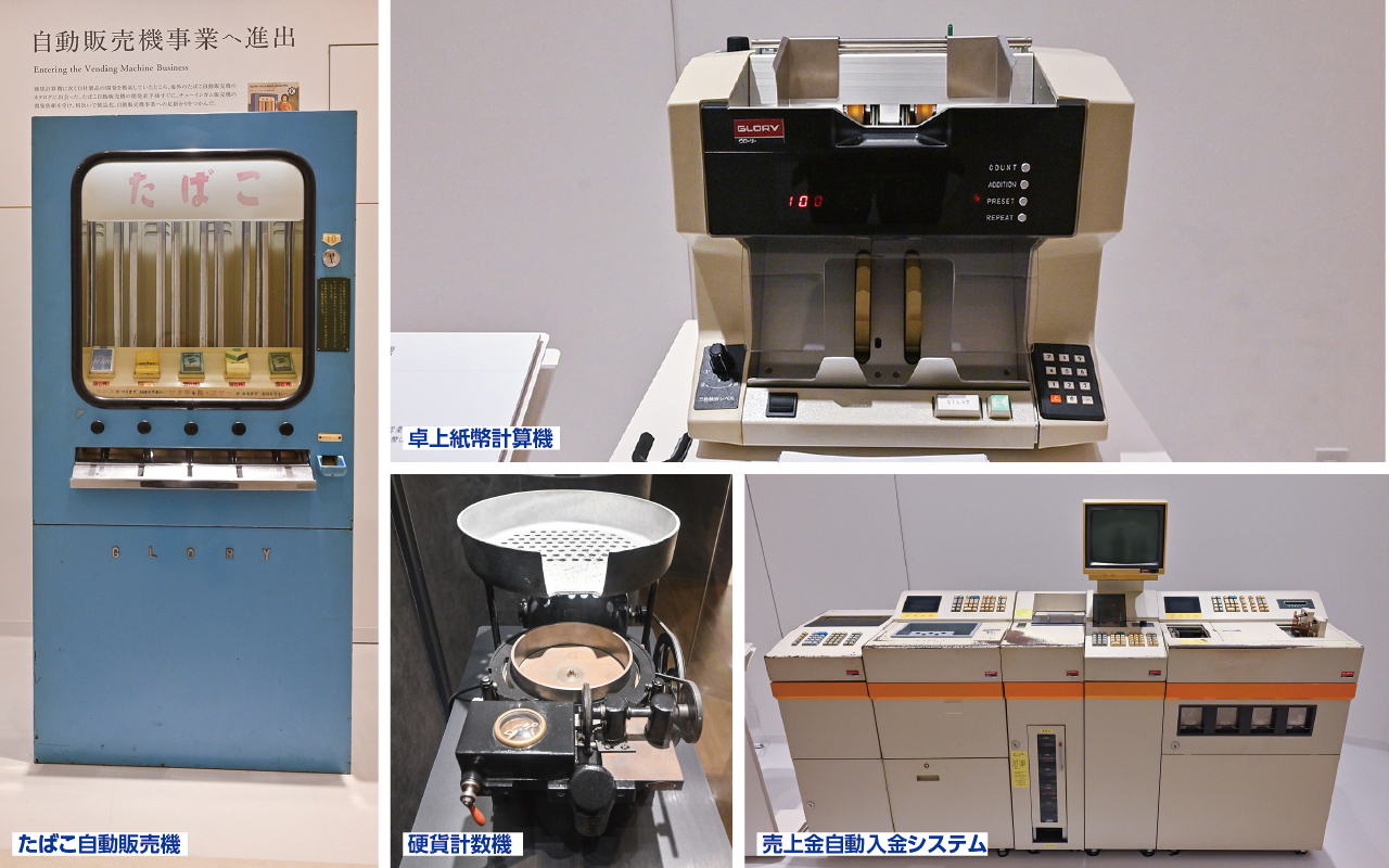 1950年に国産第1号となる「硬貨計数機」(左上)を完成させた。これが同社における高度な通貨処理技術の原点であり、その後も自動販売機や硬貨両替機、紙幣計算機といった各分野で国産初の製品を開発。時代のニーズに合わせて、自社製品の幅を着実に広げていくこととなった。