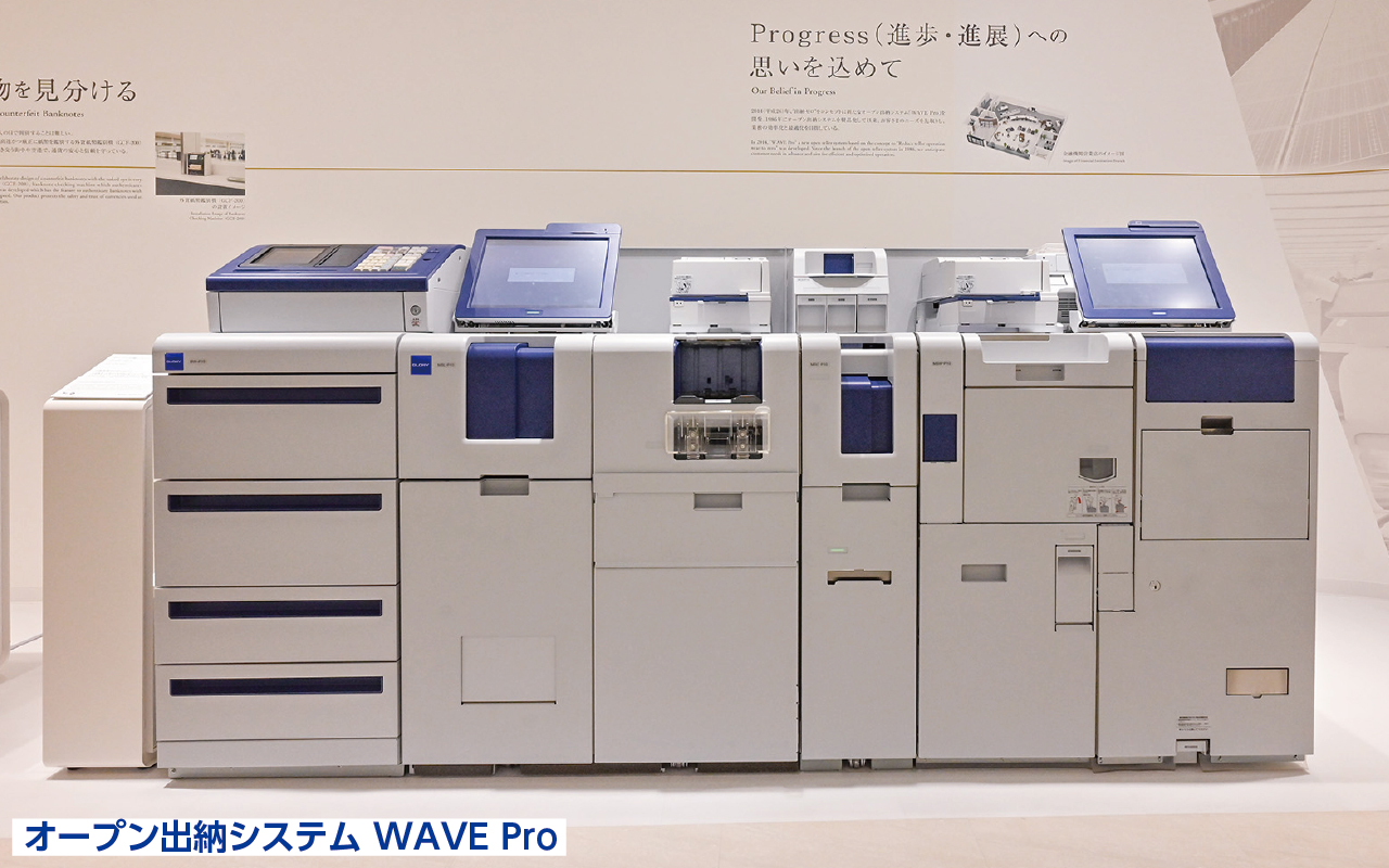 2014年に発売されたオープン出納システム。進化した新機能で自動化と厳正な管理を両立し、担当者や管理者の業務負担を劇的に削減。グローリーナスカ本社ショールームでも最新モデルの「WAVE Pro」を展示中だ。