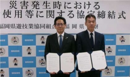 福岡県遊技業協同組合は4月3日、福岡県警察と「災害時における施設利用に関する協定」を締結した。締結式は福岡県警察本部で行われた。